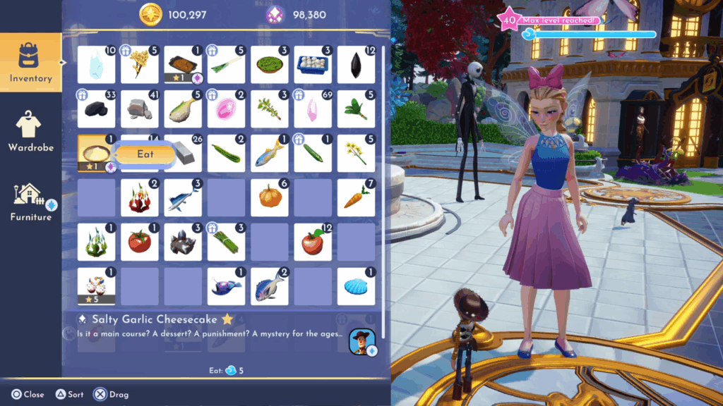 - Eat the meals Woody prepared: Gooey Paste and Salty Garlic Cheesecake. Open up your backpack. There you can find the meals and eat them.