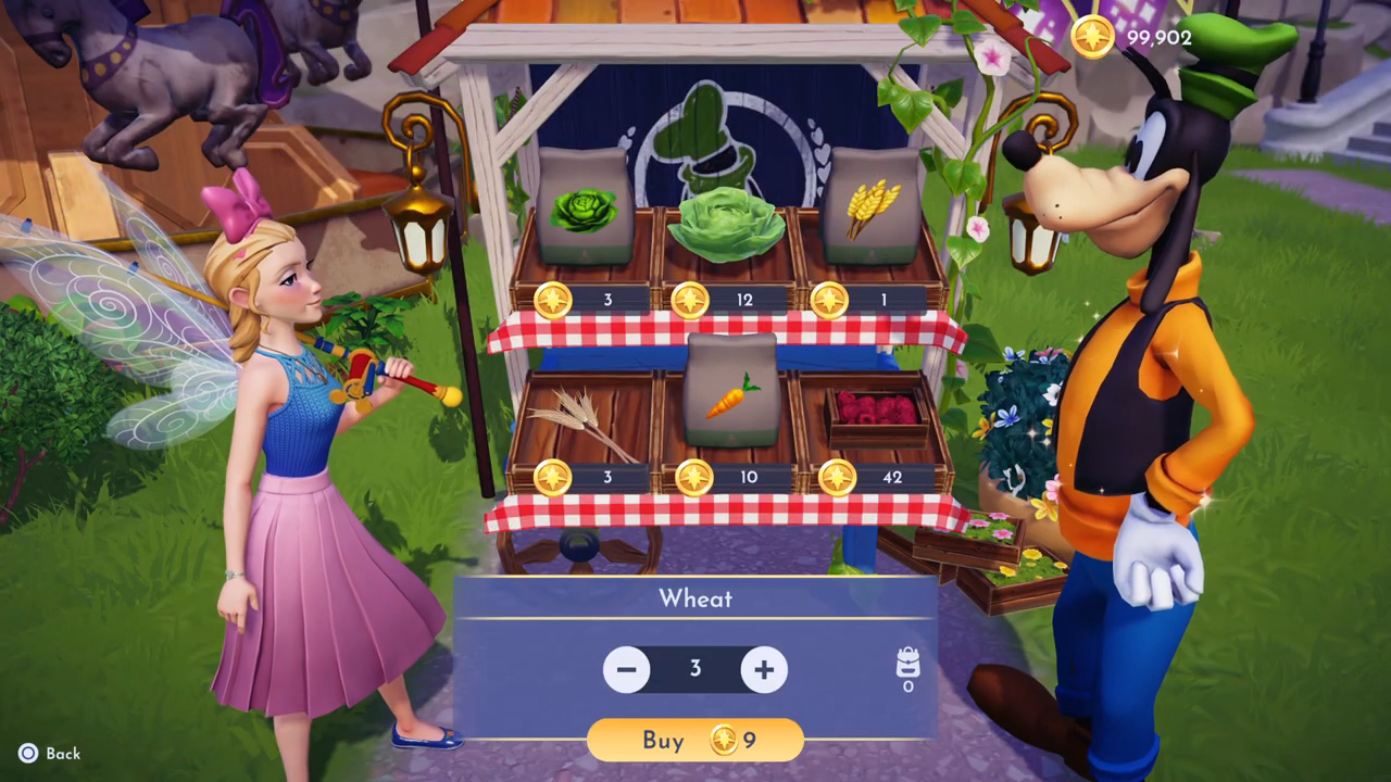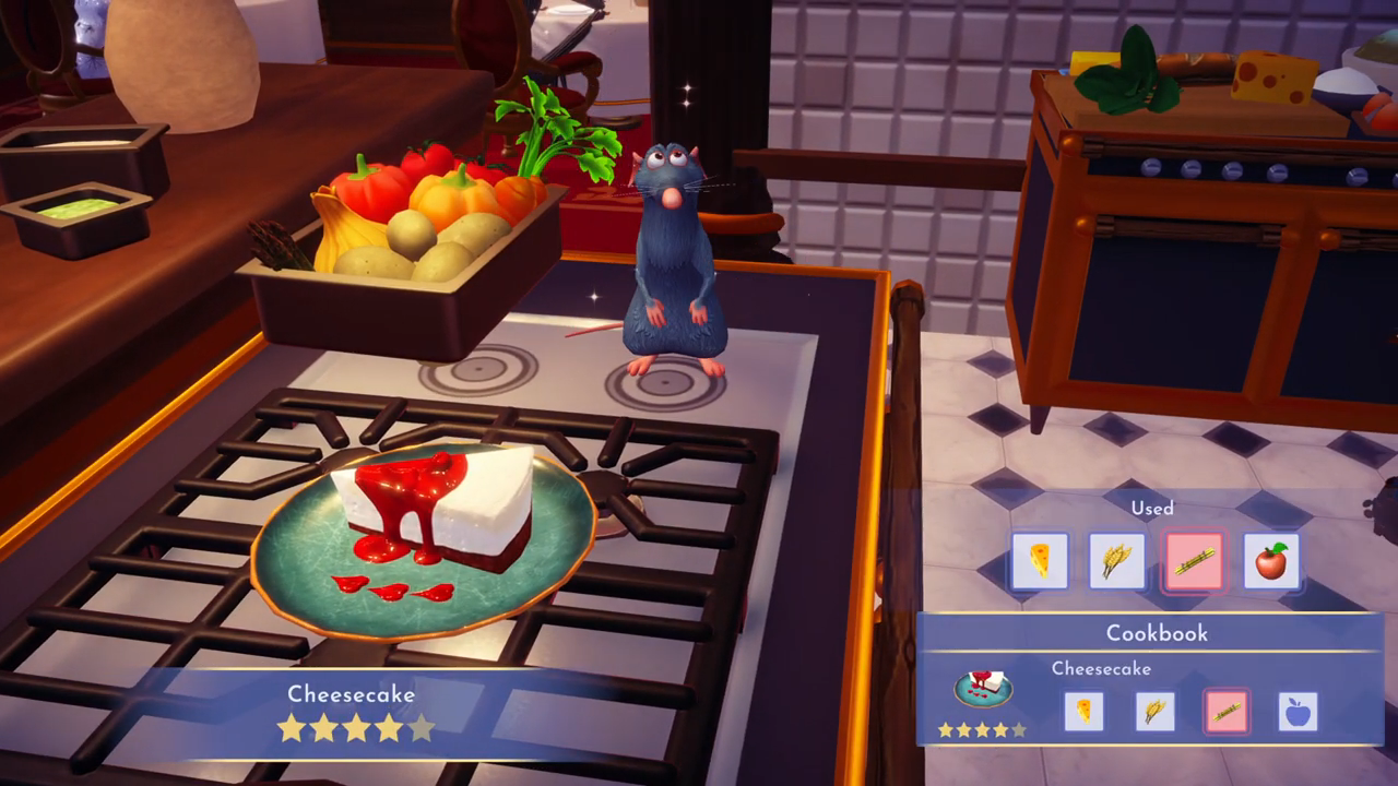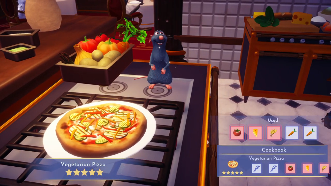 - Cook the following meals: vegetarian pizza and cheesecake. You can make a vegetarian pizza from two vegetables, tomato, cheese, and wheat. The cheesecake you can make from cheese, wheat, sugarcane, and a fruit. Tomatoes and sugarcane you can get at Goofy’s stall at Dazzle Beach. Wheat you can get at Goofy’s stall in the Peaceful Meadow, and cheese you can get at Remy’s restaurant. You can buy fruits and vegetables at Goofy’s stalls.