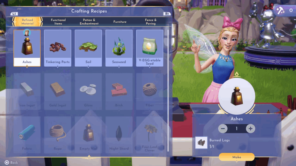 • Grind the Burned Logs into Ashes at a Crafting Station: Go to a crafting station and make some ashes from the logs.