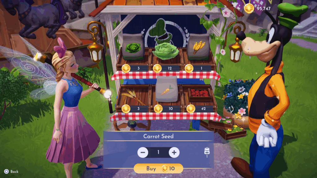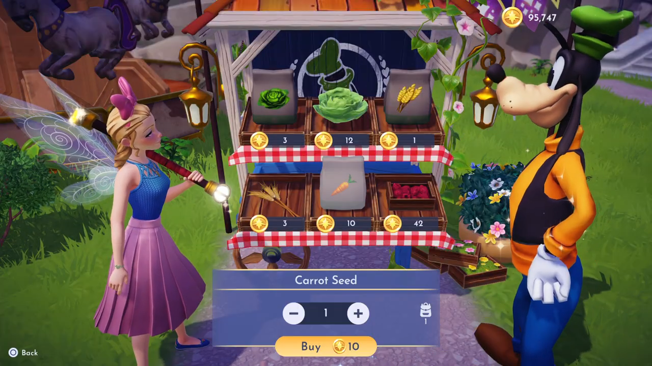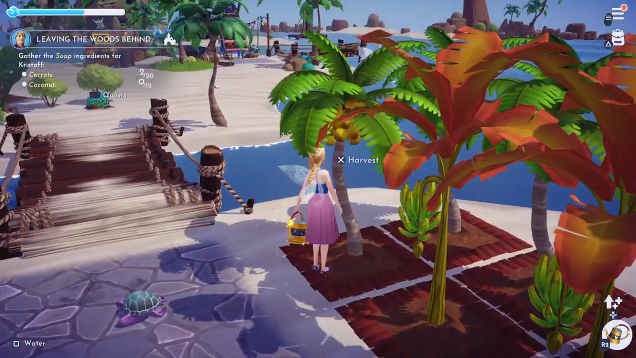 • Gather the soap ingredients for Kristoff: 20 carrots and 12 coconuts. Coconuts can be found on Dazzle Beach, and the carrots you can buy at Goofy’s stall in the Peaceful Meadow.