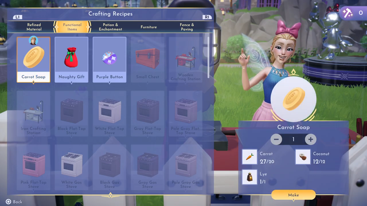 • Craft the Carrot Soap: go to a crafting station to make the soap from the lye, carrots, and coconuts.